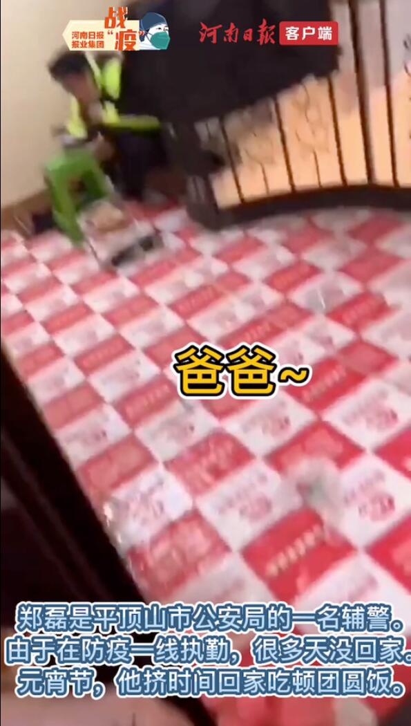 視頻中的男主人公叫鄭磊,是平頂山市公安局光明路派出所交管巡防大隊的一名輔警。由于在防疫一線執(zhí)勤,很多天沒回家,元宵節(jié)當(dāng)天晚上,妻子叫他擠時間回家吃頓團(tuán)圓飯?紤]到家人的健康,鄭磊便蹲在了門外的樓梯上,就著板凳吃了起來。