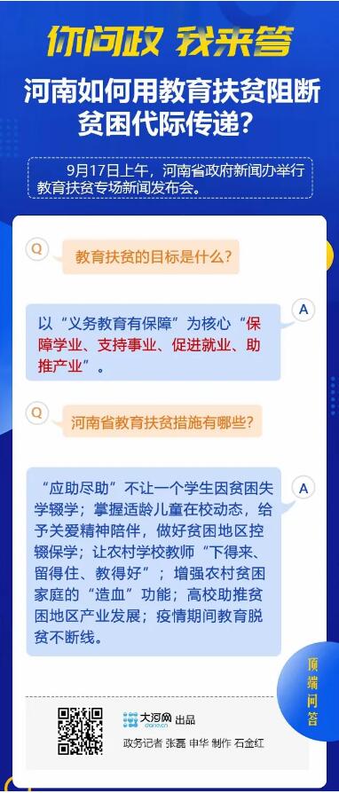 圍繞《河南省教育脫貧專項方案》《河南省教育脫貧三年行動計劃》確定的目標、任務,河南以“義務教育有保障”為核心“保障學業(yè)、支持事業(yè)、促進就業(yè)、助推產業(yè)”,取得了教育脫貧攻堅工作的顯著成績,也為全省打贏脫貧攻堅戰(zhàn)提供了有力支撐。