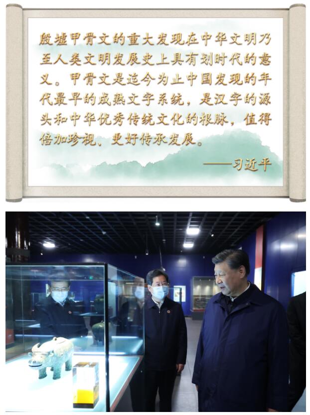 2022年10月28日,習近平總書記考察了位于安陽市西北郊洹河南北兩岸的殷墟遺址。在殷墟博物館,習近平總書記仔細觀摩青銅器、玉器、甲骨文等出土文物。