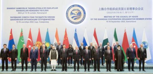 2022年9月16日,習(xí)近平在撒馬爾罕國際會(huì)議中心出席上海合作組織成員國元首理事會(huì)第二十二次會(huì)議并發(fā)表重要講話。這是大范圍會(huì)談前,與會(huì)各方集體合影。新華社記者 李濤 攝
