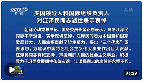 朝鮮勞動(dòng)黨總書記、國(guó)務(wù)委員長(zhǎng)金正恩表示,痛悉江澤民同志不幸逝世,表示深切哀悼。江澤民同志為中國(guó)黨和國(guó)家發(fā)展壯大、人民幸福奉獻(xiàn)了畢生精力,提出“三個(gè)代表”重要思想,為建設(shè)中國(guó)特色社會(huì)主義偉大事業(yè)作出巨大貢獻(xiàn)。江澤民同志真誠(chéng)支持、聲援朝鮮人民的社會(huì)主義事業(yè),積極致力于鞏固發(fā)展朝中傳統(tǒng)友誼。江澤民同志的功績(jī)將永垂不朽。