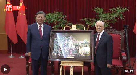 茶敘現(xiàn)場,阮富仲向習近平贈送一幅圖片。阮富仲說:“東西可能不是非常好,但是珍貴的是兄弟情誼。”