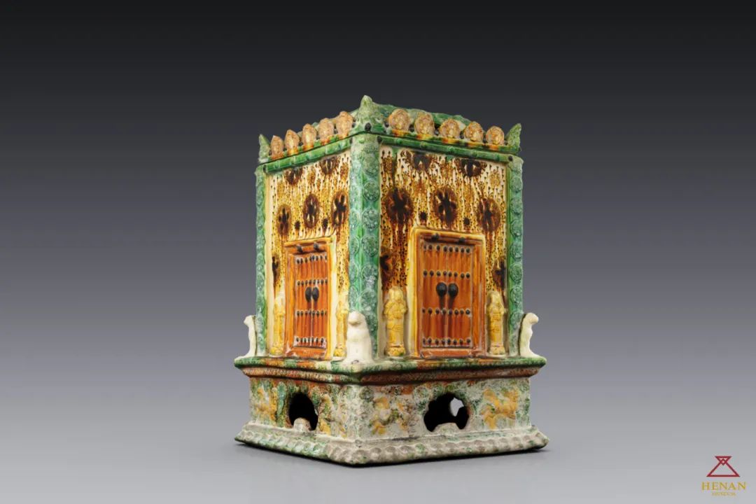 第192集:三彩舍利匣 舍利為佛祖及高僧圓寂火化后結(jié)成的珠狀物或骨燼,舍利匣用以盛放、安置舍利。 三彩舍利匣,北宋佛教葬具,通高47.3厘米,1966年河南省新密市法海寺塔基地宮出土,河南博物院藏。 舍利匣以高嶺土塑造,表面施三彩釉,分基座、匣身和頂蓋三部分。基座為束腰須彌座式,四壁中部開如意頭形鏤孔,鏤孔兩側(cè)貼塑對(duì)稱麒麟紋和蓮花紋。匣身為直口中空的方筒形,外壁四角塑有蓮花紋飾的角柱和蹲獅,中部塑有閉合的假門,門的兩側(cè)各塑有一位立于仰蓮座上的守門天王像,門上部和左右滿飾大小不同的絞釉蓮花圖案。匣蓋作盝(lù)頂形,盝頂?shù)男泵骈_有兩個(gè)并列的圓形鏤孔,周圍飾蕉葉、蓮花和朵云圖案。 舍利匣雕塑精美,色彩艷麗,浸潤(rùn)過千年鐘聲陣陣,香火裊裊,在時(shí)間之中擺脫了時(shí)間,凝結(jié)為永恒。
