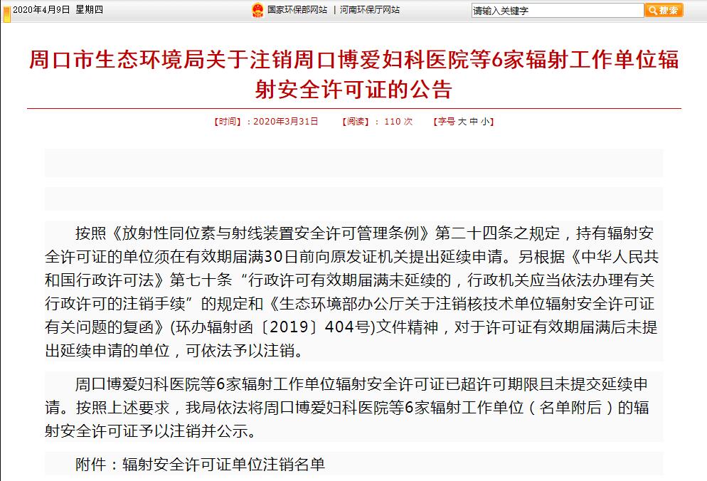 周口博愛婦科醫(yī)院等6家單位輻射安全許可證已超許可期限且未提交延續(xù)申請。按照有關(guān)要求,周口市生態(tài)環(huán)境局依法將周口博愛婦科醫(yī)院等6家單位(名單附后)的輻射安全許可證予以注銷并公示。