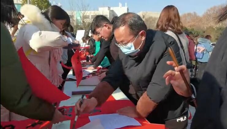 本臺訊 為了弘揚中華傳統(tǒng)文化,培育踐行社會主義核心價值觀,2021年元旦當(dāng)天,周口師范學(xué)院美術(shù)學(xué)院組織書法學(xué)專業(yè)師生,在學(xué)校杏壇廣場現(xiàn)場書寫春聯(lián),為全校師生送上新年祝福。活動從早上九點開始,持續(xù)到中午十二點多,前來領(lǐng)取春聯(lián)的師生絡(luò)繹不絕,有的自己撰聯(lián)請老師同學(xué)書寫,有的拿著春聯(lián)擺出各種造型拍照,現(xiàn)場氣氛熱烈,一派歡樂祥和的節(jié)日氛圍。