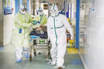 近日,武漢市蔡甸區(qū)人民醫(yī)院醫(yī)護人員在轉運新冠肺炎重癥病人。陳 卓攝(影像中國)