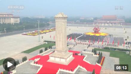 方陣前,以中共中央,全國人大常委會,國務(wù)院,全國政協(xié),中央軍委,各民主黨派、全國工商聯(lián)和無黨派愛國人士,各人民團體和各界群眾,老戰(zhàn)士、老同志和烈士親屬,中國少年先鋒隊名義敬獻的9個大型花籃一字排開;ɑ@紅色緞帶上書寫著“人民英雄永垂不朽”的金色大字。